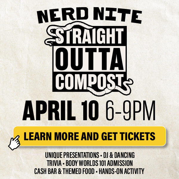 April 10, 2026; 6-9 p.m. Ages 18+ Get ready to dig in, literally. April’s Nerd Nite unearths the strange and surprisingly riveting worlds of compost and foraging. Learn how…