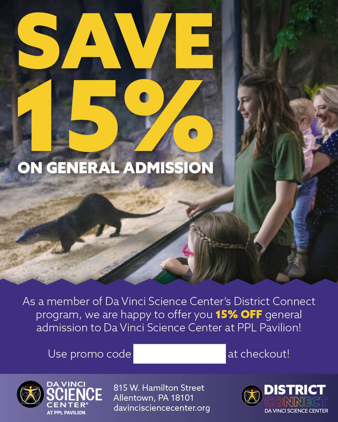 Share the news about the 15% off general admission tickets that all district faculty, staff, and families receive as a benefit for being District Connect members.