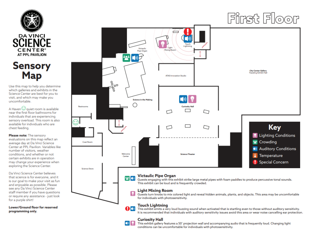 Da Vinci Science Center at PPL Pavilion’s Sensory Hour offers a supportive and welcoming science center experience for guests who benefit from a calmer, sensory-friendly environment. During this dedicated hour, the science center adjusts lighting, sound, and exhibit effects to reduce sensory stimulation while still encouraging exploration and discovery.